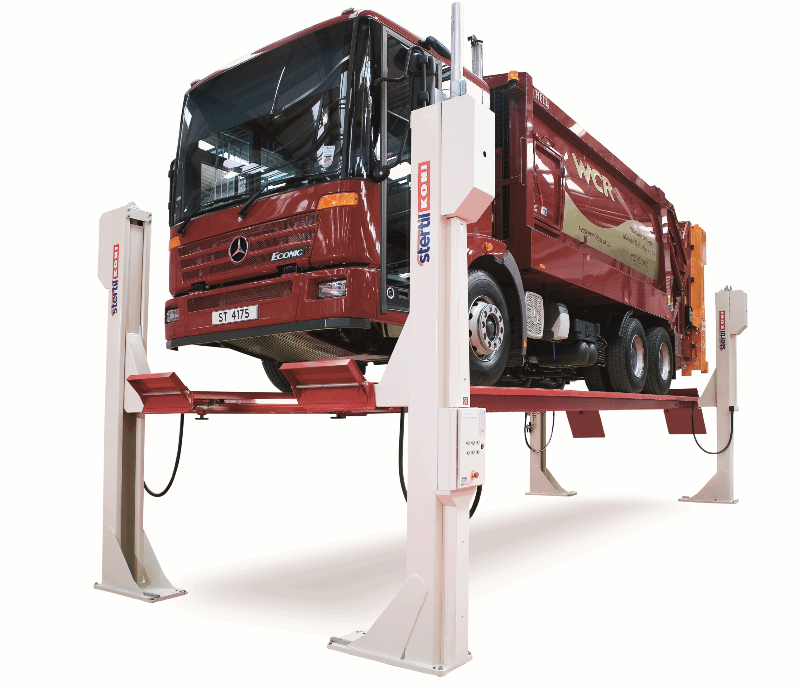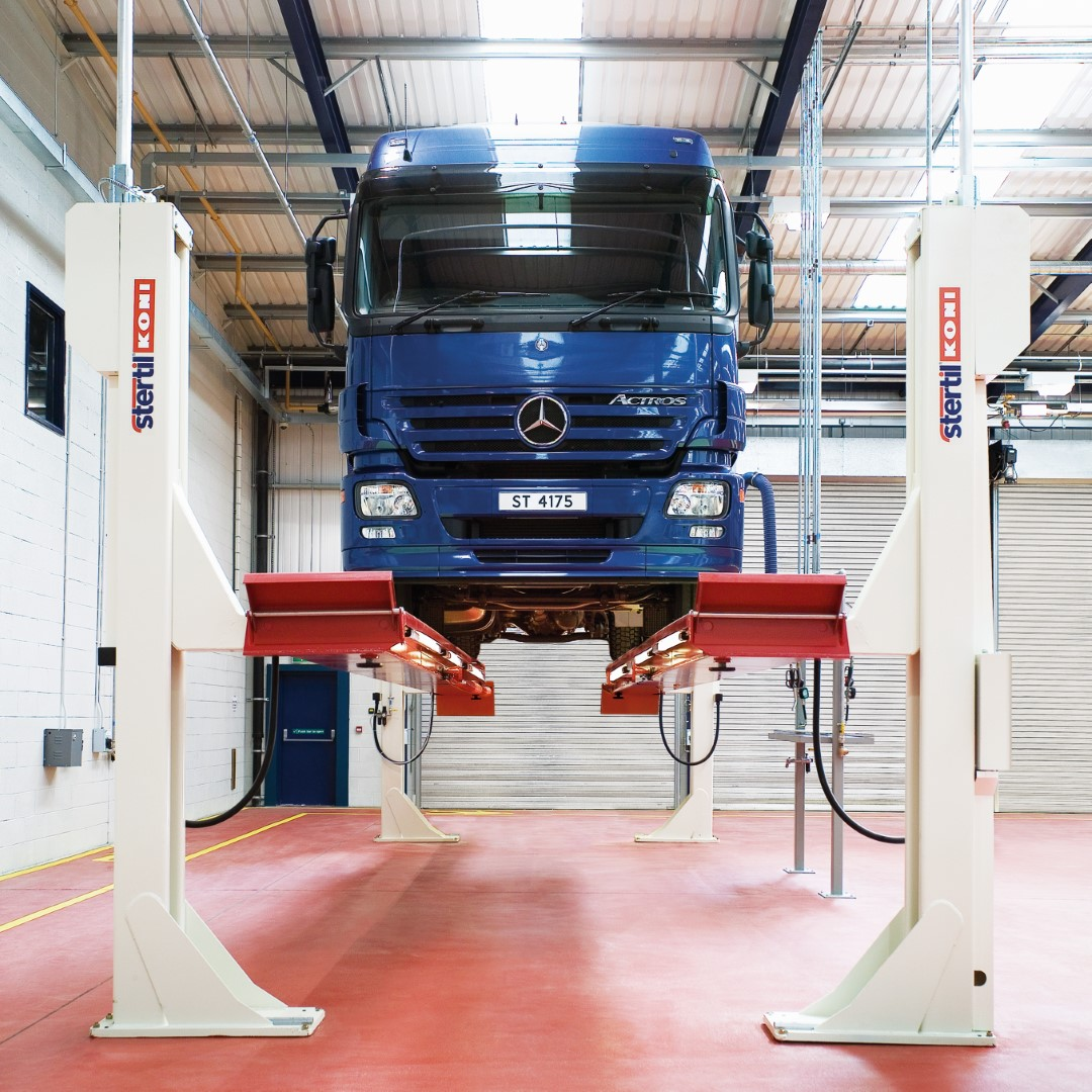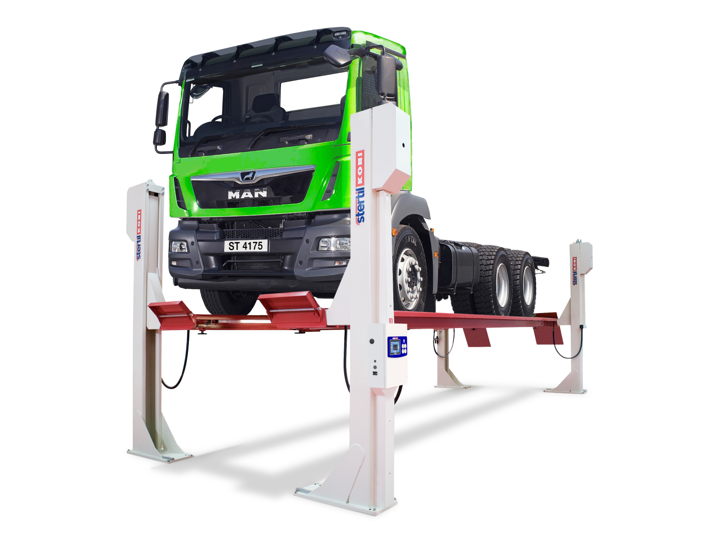 High lifting 4 post hoists for vehicles 17,500 kg to 25,000 kg. Low drive on height 230 mm to 285 mm. Overload prevention built into the hydraulic lifting cylinders. Stertil Koni’s patented mechanical locking permanently enabled. Two 4 posters can combine into a tandem lift up to 11,500 mm length. Smooth lifting and lowering of uneven loads. Automatic LED lighting built into the platform for undercarriage illumination.
