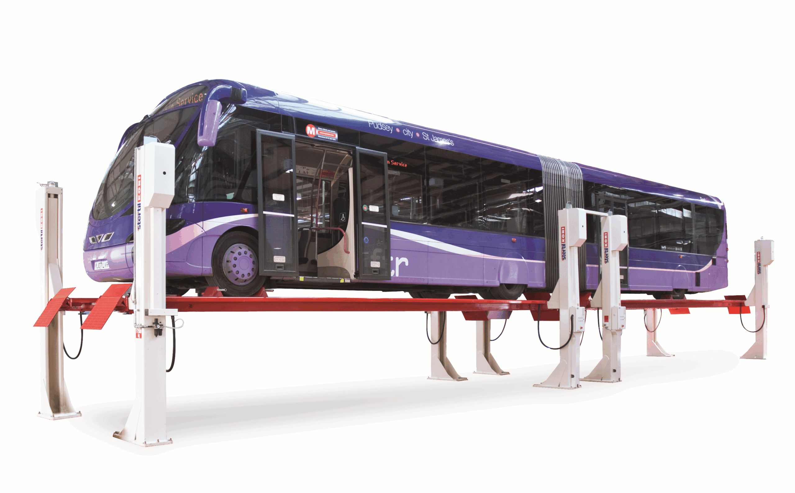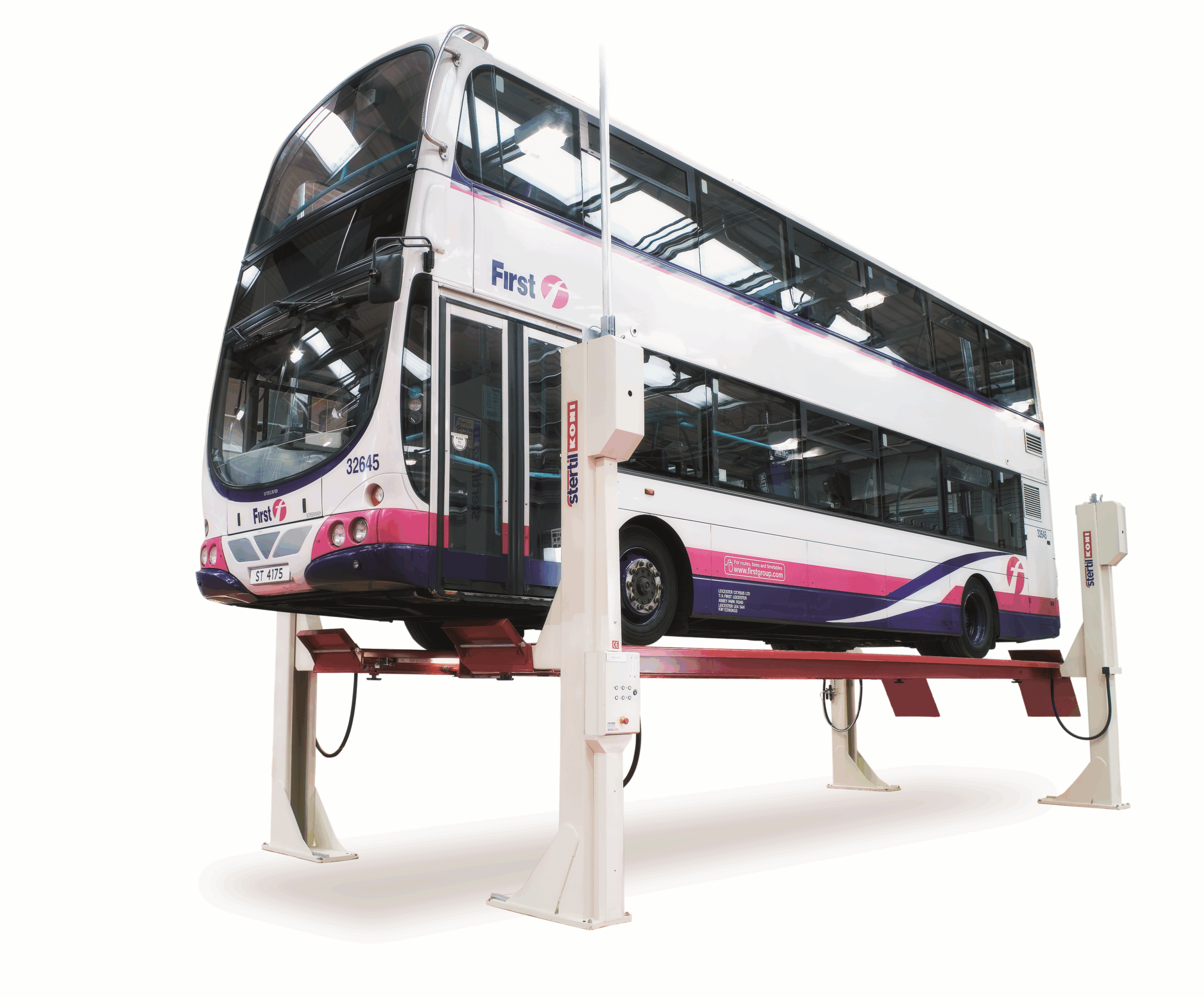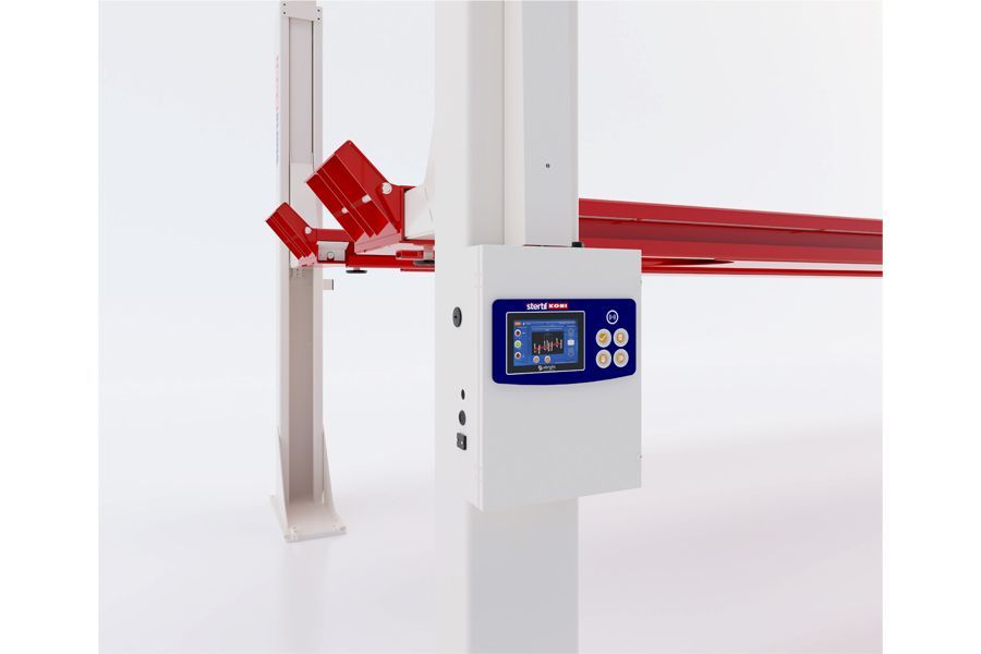 High lifting 4 post hoists for vehicles 17,500 kg to 25,000 kg. Low drive on height 230 mm to 285 mm. Overload prevention built into the hydraulic lifting cylinders. Stertil Koni’s patented mechanical locking permanently enabled. Two 4 posters can combine into a tandem lift up to 11,500 mm length. Smooth lifting and lowering of uneven loads. Automatic LED lighting built into the platform for undercarriage illumination.